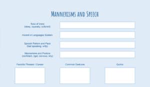 Knowing the basic background information about your character is a good starting point to building an imaginary person. This section helps fill out some additional specifics that weren’t already covered by the general information section.